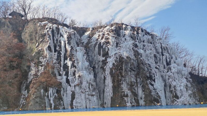 포토 청송읍 '현비암' 빙벽, "장관이네~" 30일 경북 청송군 날씨가 −5 °C ~ −2 °C로 떨어지자 청송읍 월막리 용전천은 두께 약 2cm의 얼음이 얼었고 높이 약 20M 현비암(경상북도 명승지)의 얼음 빙벽이 장관을 이루고 있다. -