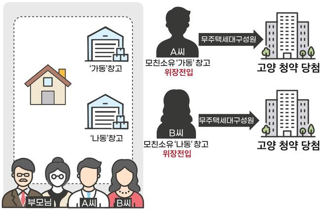 국토부는 형제간 각각 인접 창고 건물에 허위 전입신고 후 추첨제로 당첨된 사례, 배우자를 장인·장모 집에 위장전입시켜 부양가족 가점을 받아 당첨된 사례 등을 주요 사례로 공개했다.